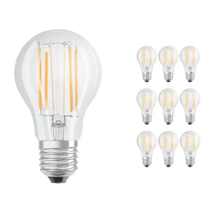 La Confezione Multipack 10x Ledvance CLASSIC LED E27 Pera Filamento Chiara 7.5W 1055lm - 827 Bianco Molto Caldo | Dimmerabile - Sostitutiva 75W è la perfetta sostituzione per la tua lampada convenzionale 75W con attacco E27 grazie alla sua tecnologia LED. Passare a LED ti offrirà tanti vantaggi!