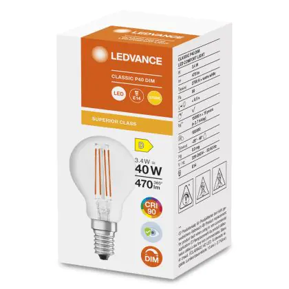 La lampada Ledvance Superior Classic LED E14 Sferica Filamento Chiara 3.4W 470lm - 927 Bianco Molto Caldo | Dimmerabile - Miglior resa cromatica è il sostituto perfetto per le tue vecchie lampade 40W con attacco a vite piccolo E14 grazie alla sua tecnologia LED. Passare a LED ti offrirà molti vantaggi!