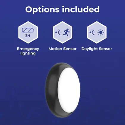 Noxion Bulkhead LED Pro V2 Bianca 12/16/20W 2400lm - 830-840-865 CCT | 325mm - IP65 - Sensore di Movimento e Luce - Emergenza 3H + Il Anello Nero