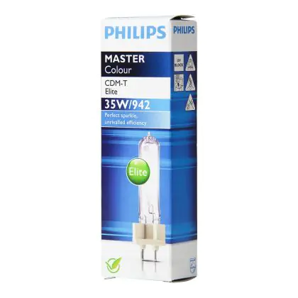 Le Philips CDM-T Elite 35W 942 G12 (MASTERColour) sono lampade a scarica compatte da 35W con attacco G12 che emettono una luce brillante assicurando colori stabili per tutto l'arco della loro vita, pari a 15000 ore. Ció che le contraddistingue rispetto alle normali Philips CDM-T é la più lunga vita media e il più alto indice di resa cromatica pari a 90-100Ra che sta ad indicare un'ottimale esaltazione delle caratteristiche dell'oggetto illuminato. Da notare anche l'intensità del flusso luminoso che raggiunge un livello pari a 3800 lumen. Le Philips CDM-T Elite 35W 942 G12 (MASTERColour) integrano un filtro UV che consente di limitare fortemente lo scolorimento degli oggetti illuminati.