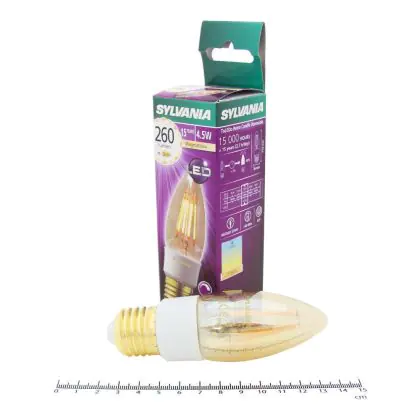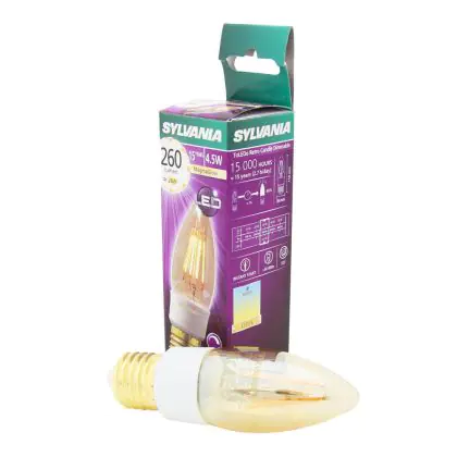 Questa lampadina rétro Sylvania a forma di candela è la soluzione ideale per un’illuminazione decorativa. Il design rétro con i filamenti interni visibili ricorda le vecchie lampadine ad incandescenza. È adatta per un'installazione su lampadari a bracci in salotti, ristoranti, bar e negozi per regalare all’ambiente un tocco di storia ed eleganza. La temperatura del colore caldissima da 1700 Kelvin favorisce un’atmosfera accogliente e rilassante. Grazie alla tecnologia LED integrata potrai approfittare di un risparmio significativo sui costi energetici e di manutenzione! Inoltre, consente di regolare l'intensità luminosa in base alle preferenze illuminazione. Questa lampadina, infatti, sostituisce le soluzioni da 25 W con attacco E27 consumando solo 4.5 W. Presenta un ciclo di vita fino a 40 volte più lungo rispetto ad una lampadina ad incandescenza e diversamente dalle lampade a risparmio energetico offre un’accensione istantanea fino al massimo della potenza. Inoltre, costituisce un’ottima alternativa ecologica in quanto non contiene materiali pericolosi per il nostro organismo e per l’ambiente.